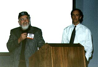 Here Craig Adkins demonstrates his stereoscopic camera rig to Chad ?, Lowell Noble and Peter Anderson. Craig entered the presentation room for his presentation like this although he wasn't game enough to wear his roller blades...